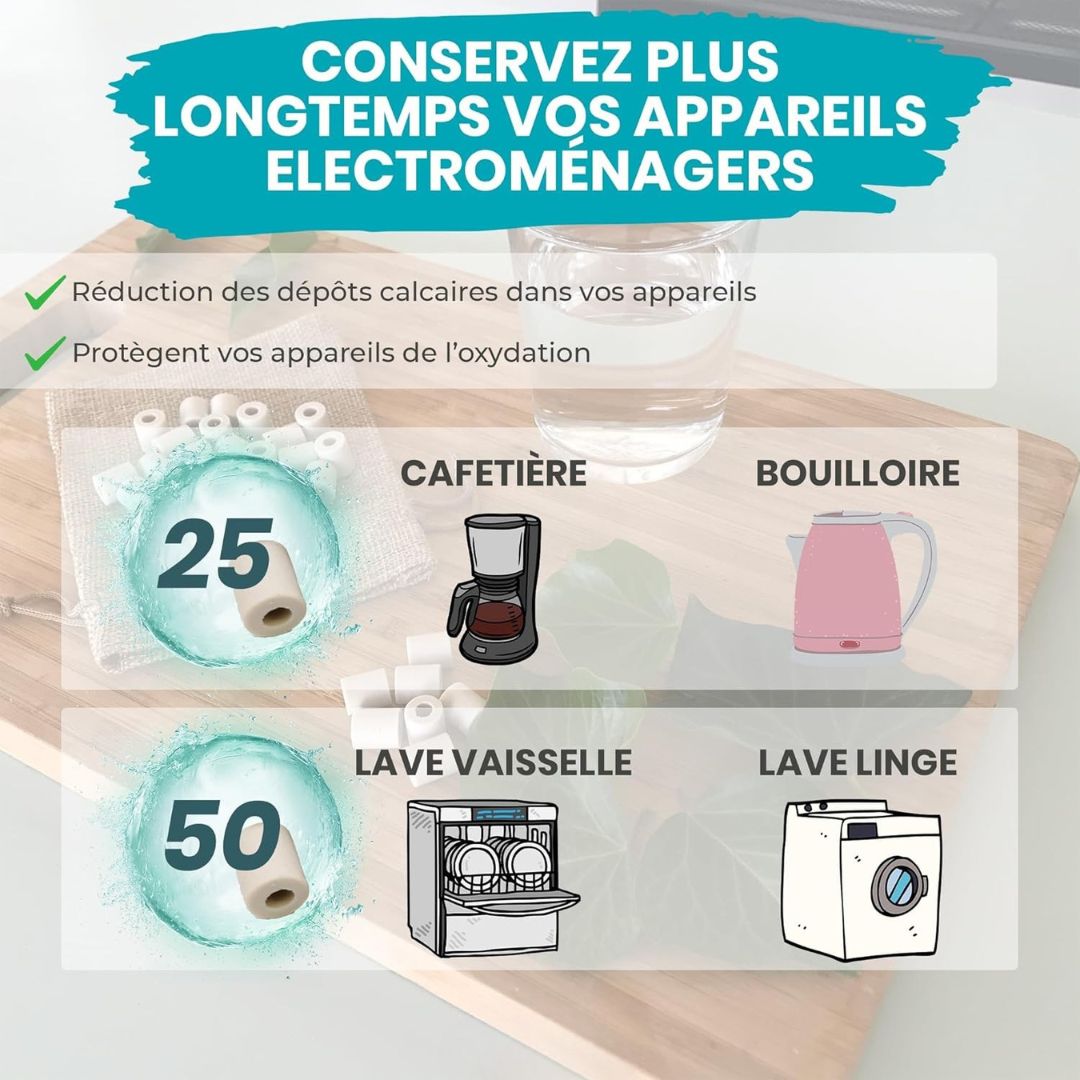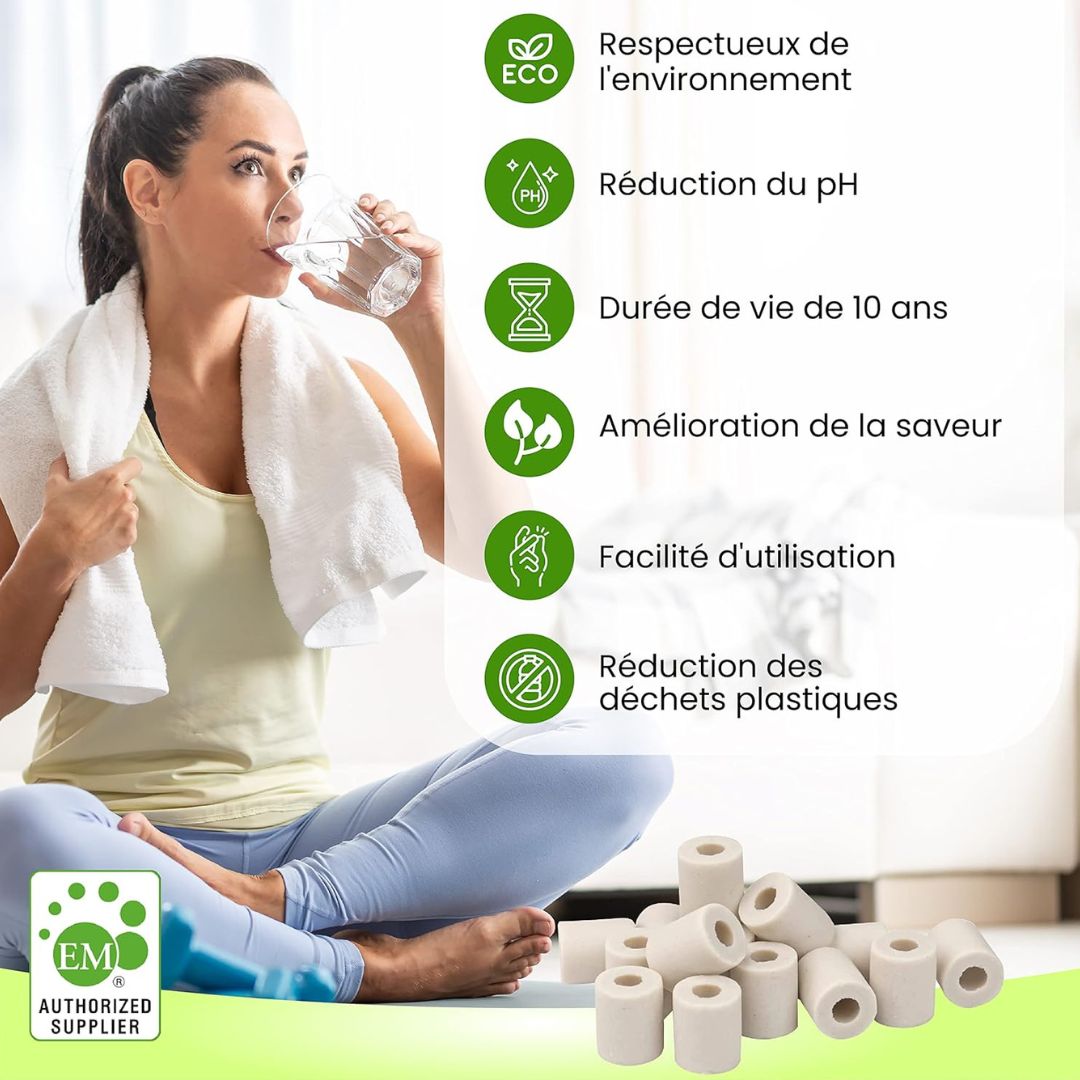 Les perles de céramique EM® ne modifient pas la teneur minérale naturelle de l’eau, mais transforment le calcaire pour qu’il soit moins adhérent. Résultat : il se dépose beaucoup moins sur vos carafes, bouilloires et appareils, pour un entretien facilité et une eau plus agréable à boire.